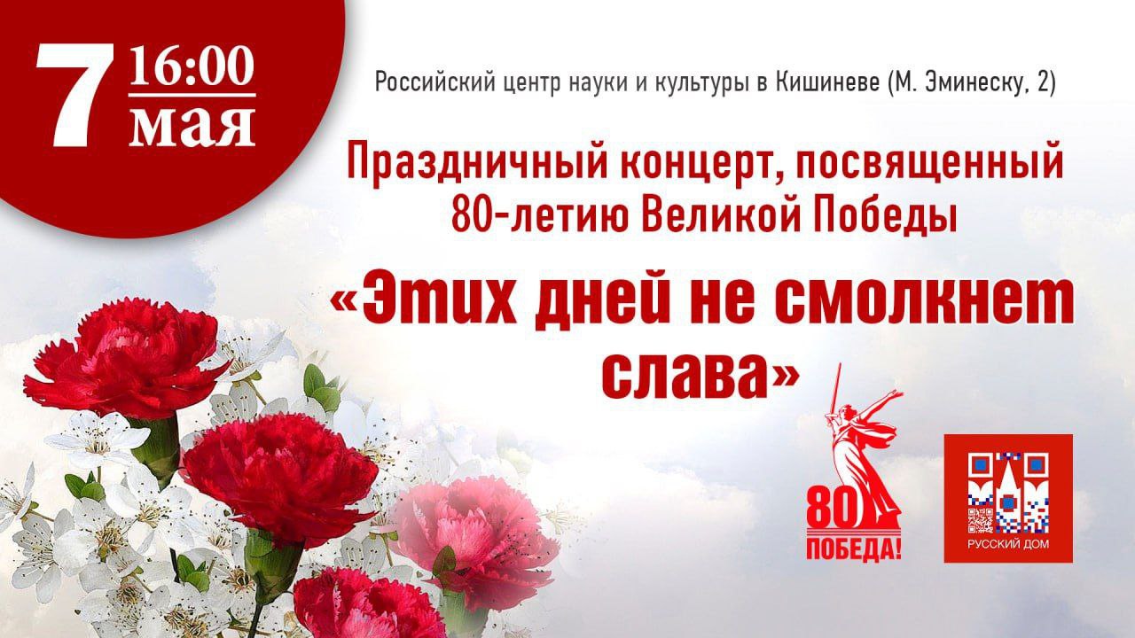 Российский центр науки и культуры в Кишиневе и Русская община Республики Молдова приглашают жителей и гостей столицы на праздничный концерт «Этих дней не смолкнет слава», приуроченный к 80-летию Победы в Великой Отечественной войне. Мероприятие состоится 7 мая в 16:00 на сцене Русского дома.